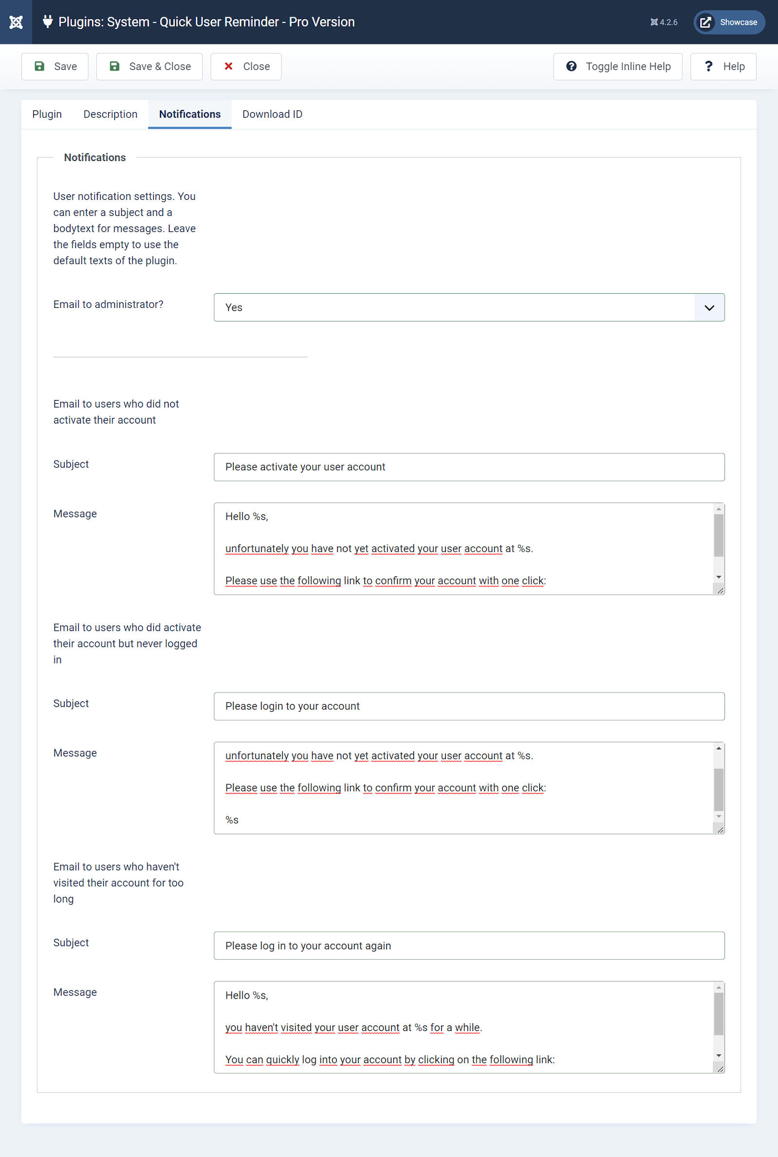 This plugin notifies users from non-activated and/or inactive user accounts in Joomla! automatically. You can individually configure the account types to be notified (not activated, not logged in or inactive) by specifying a time period. If user accounts match the type and the selected period of time, the associated users are automatically notified when a specific event occurs. For example, you can remind users to confirm their registration or to come back to your site.